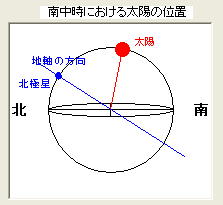 南中時における太陽の位置・地軸の方向・北極星の表示を行います。